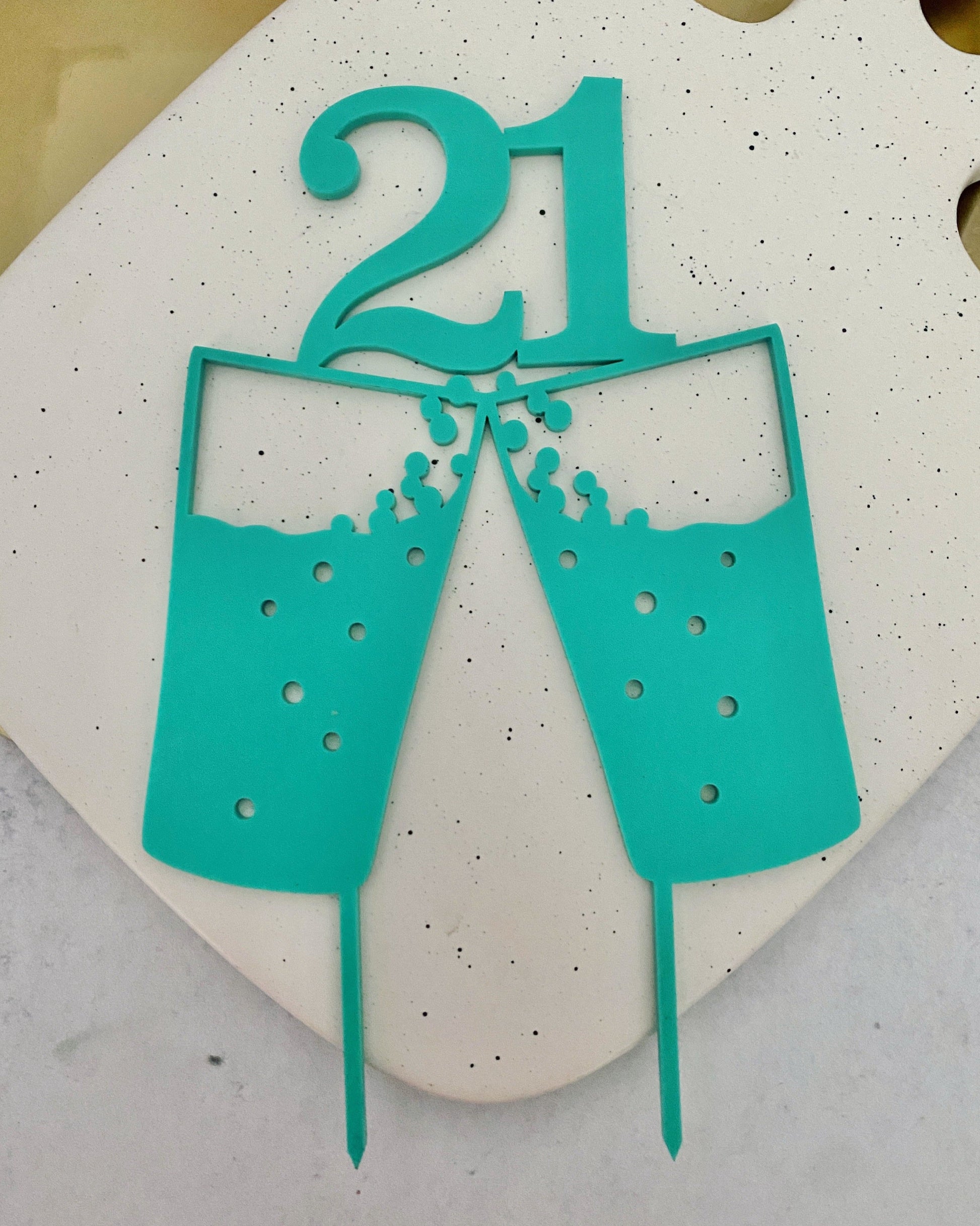 Celebrate turning 21 with this fun cake topper featuring bubbly pint glasses giving each other "cheers." It's the perfect addition to a 21st birthday cake. Get ready to party (responsibly, of course) with this fun and playful cake topper, available in a variety of colors.