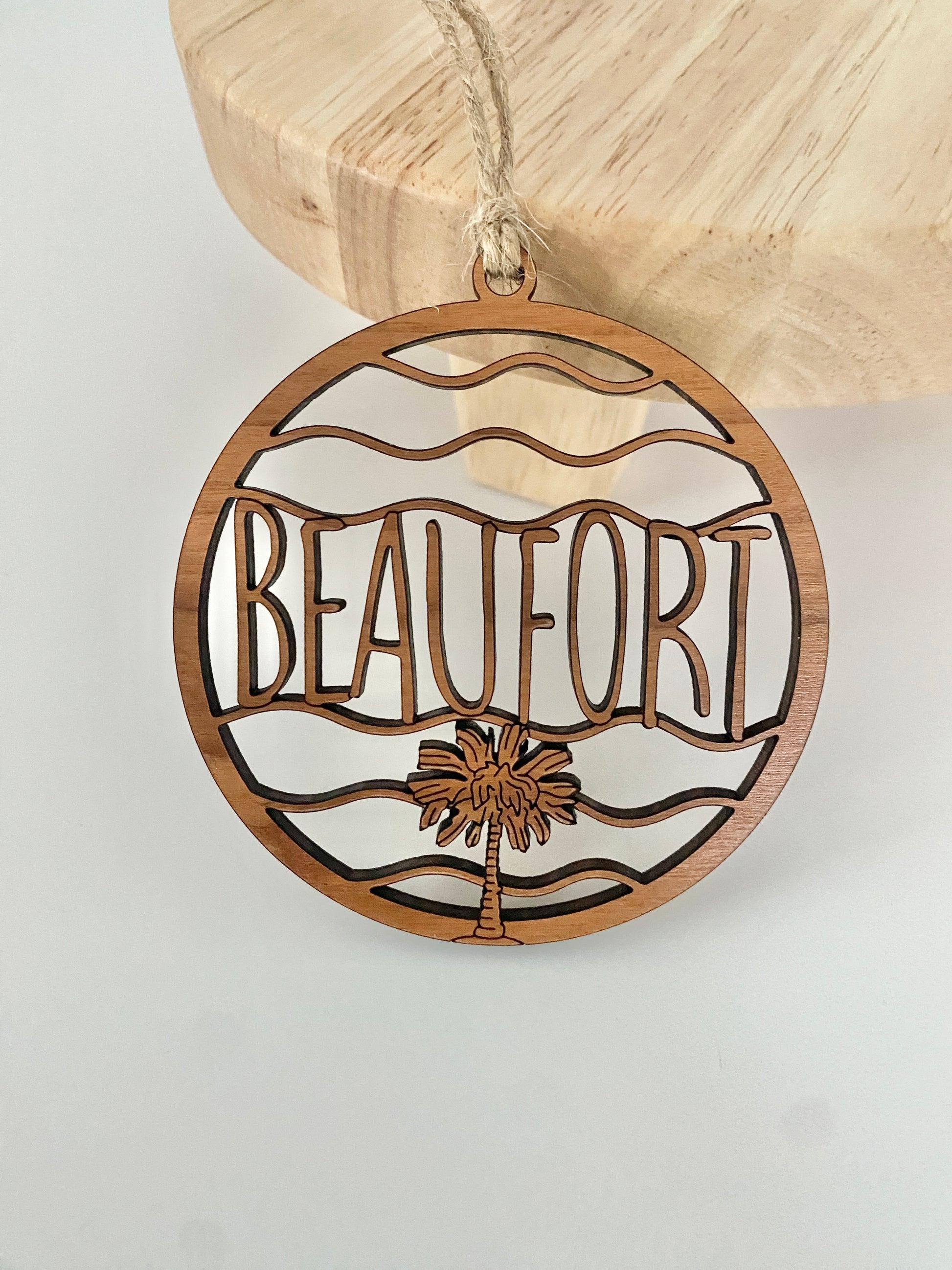 Crafted from your choice of wood or frosted acrylic (it looks like sea glass!), this circular ornament pays homage to the sandy shores of Beaufort, South Carolina, complete with waves and an iconic palmetto tree. It's the perfect souvenir to commemorate your beach vacation.