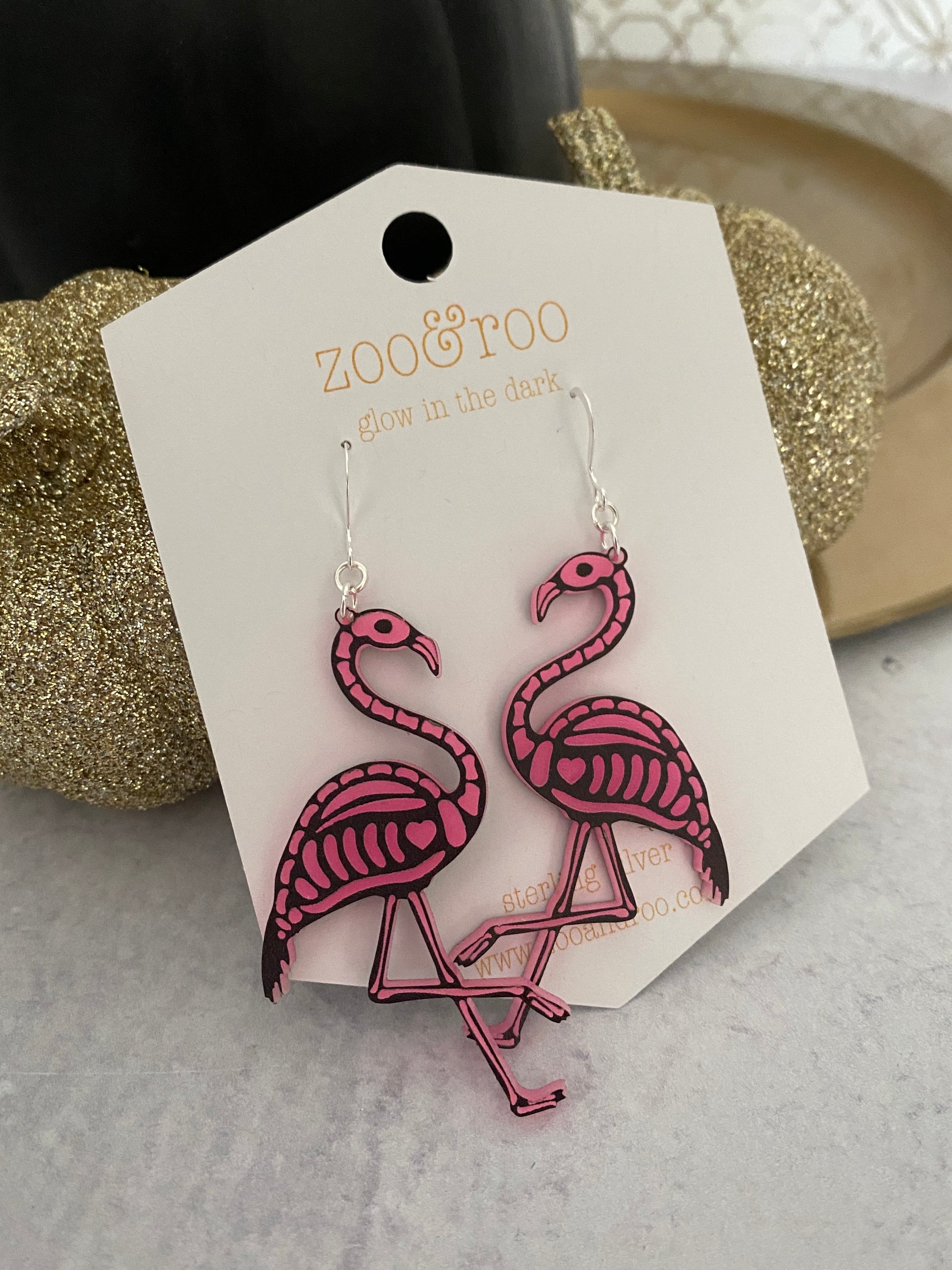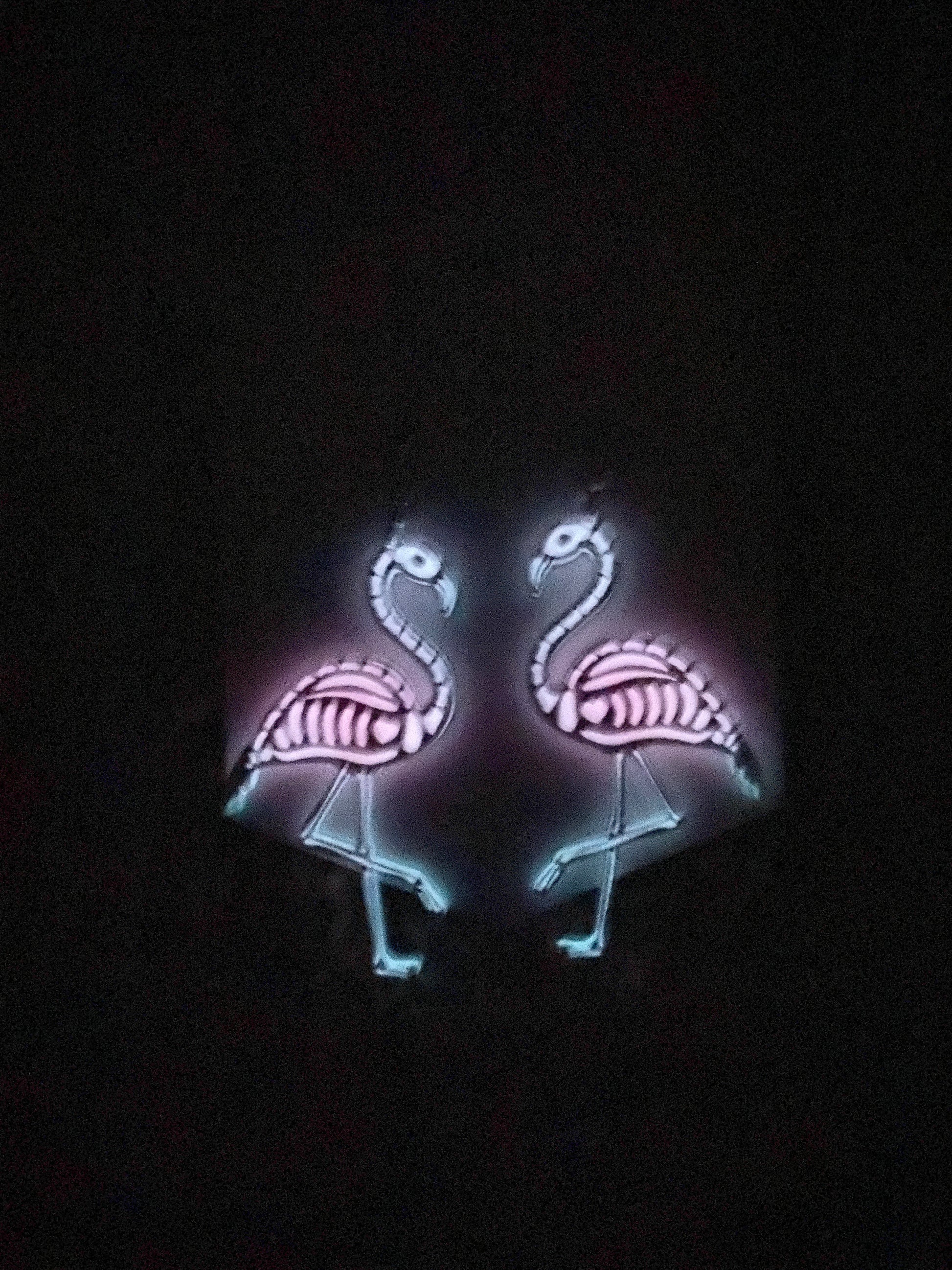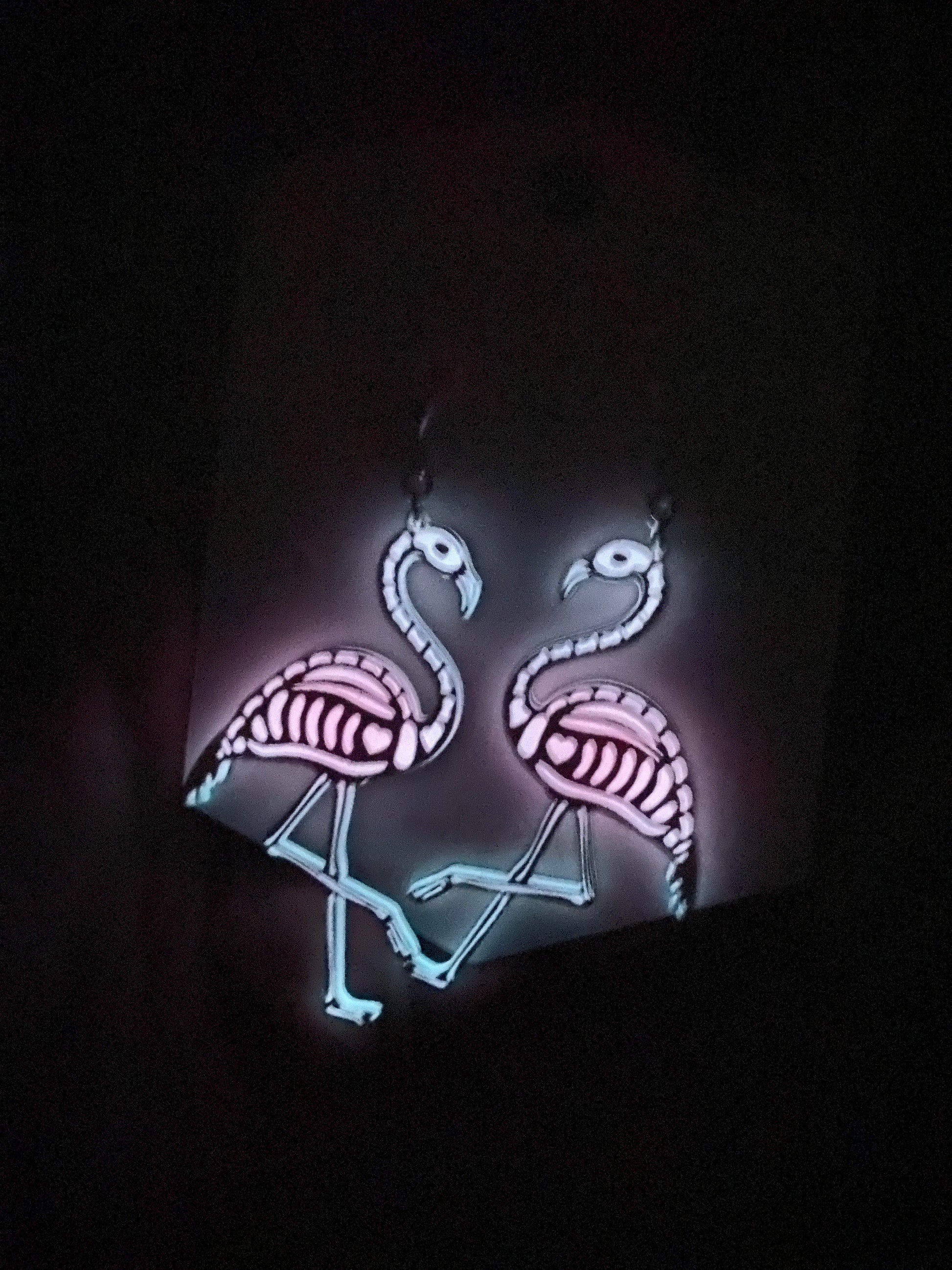 Illuminate your Halloween ensemble with these glow-in-the-dark acrylic flamingo earrings! Perfect for any party animal, these earrings are sure to make a statement all night long.