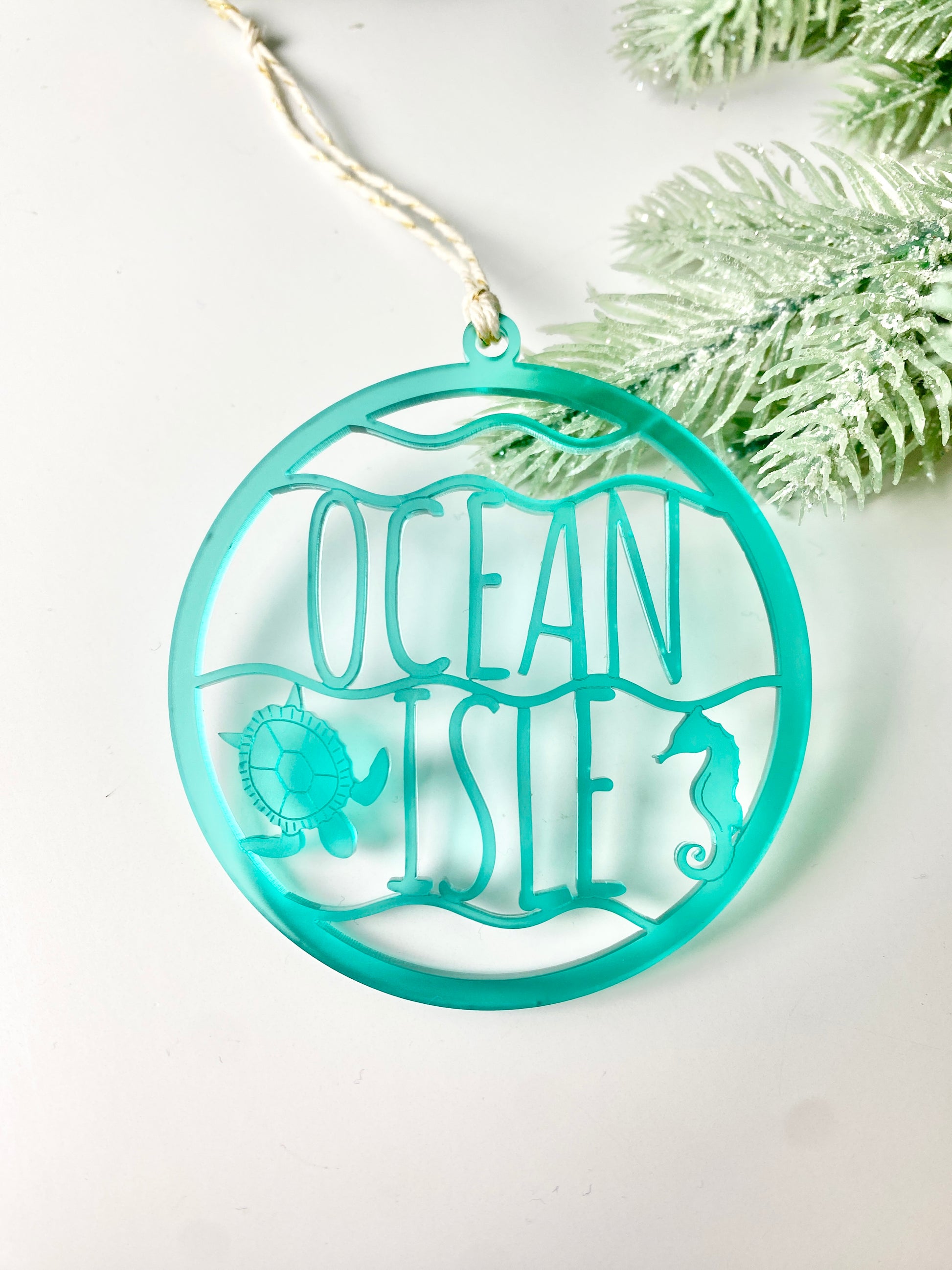 Crafted from your choice of wood or frosted acrylic (it looks like sea glass!), this circular ornament pays homage to the sandy shores of Ocean Isle on the beautiful coast of North Carolina, complete with waves, turtle and seahorse. It's the perfect souvenir to commemorate your beach vacation or your favorite destination.