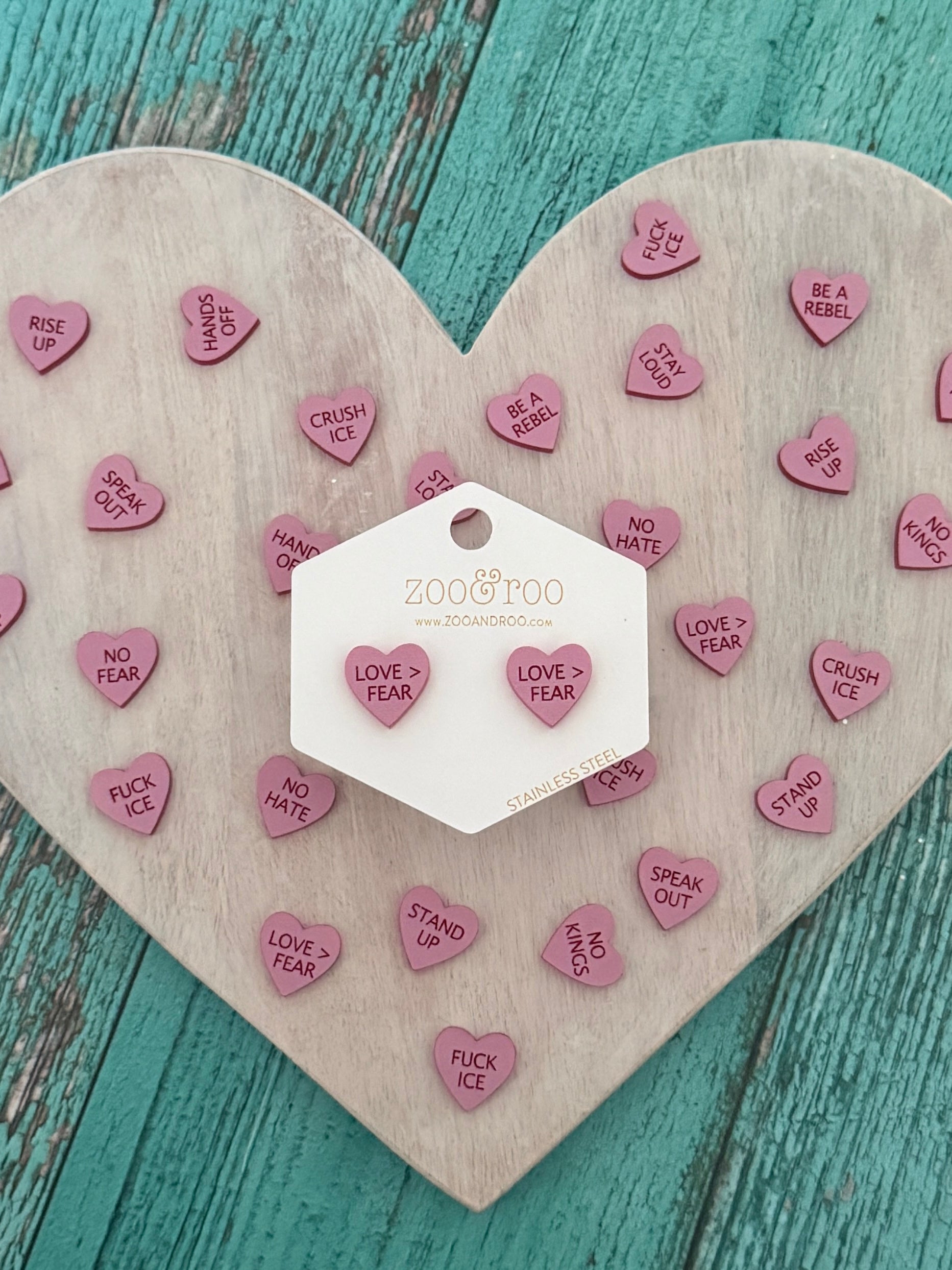 Each pair is lightweight, comfortable for everyday wear, and made in small batches by me with intention. Protest Hearts are rooted in human rights, dignity, resistance, and love without fear. The collection may expand over time, but every phrase is chosen deliberately—because protest doesn’t always look like a megaphone. Sometimes it looks like pink hearts and steady courage.